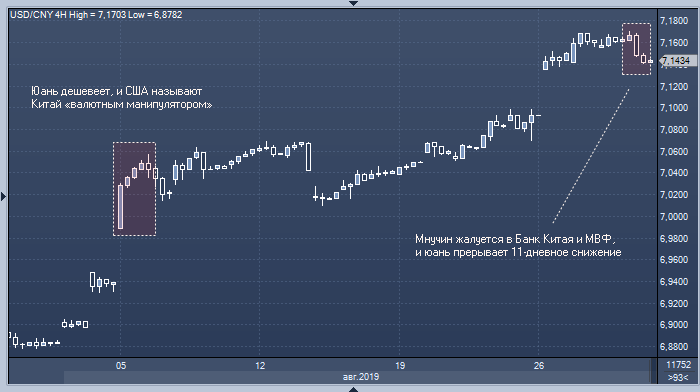 По состоянию на среду курс юаня снижался уже 11 сессий подряд, что заставило министра финансов США Стивена Мнучина пожаловаться на сложившуюся ситуацию в Банк Китая и МВФ. В четверг юань прервал даунтренд и заметно вырос к доллару.