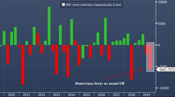 На неделе до 7 августа был зафиксирован рекордный за всю историю (ProFinance.ru: начиная с 1993 года) отток капитала в $4.1 млрд. С начала квартала из указанных выше инструментов утекли чистые $10.2 млрд, и если эта тенденция продолжится в ближайшие недели, то третий квартал рискует стать наихудшим за всю историю, превзойдя второй квартал 2013 года, когда развивающиеся рынки покинули $13.7 млрд.