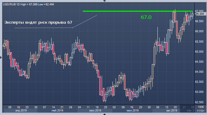 «На российскую валюту давит постоянно укрепляющийся к основным мировым валютам доллар… Курс российской валюты в ближайшие дни будет определяться исключительно ситуацией на внешнем валютном рынке. Во вторник не исключена возможность тестирования паройдоллар-рубль отметки 67, пробитие которой откроет дорогу в район 69», — считает аналитик Алор Брокер Алексей Антонов.