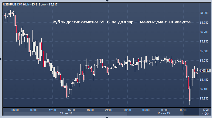 Рубль достиг отметки 65.32 за доллар — максимума с 14 августа, при открытии торгов на Мосбирже расчетами «завтра», но сейчас сдал назад и торгуется уже на 65.49. К евро он растет на 0.1% до 72.33.