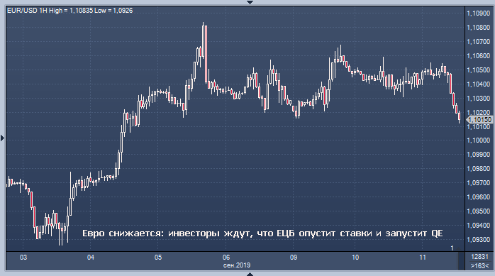 EUR/USD падает на 0.3% до 1.1015, понижение евро происходит в течение второго дня подряд. Рынки ждут, что ЕЦБ понизит ставку по депозитам и обнародует дальнейшие меры стимулирования.1-недельная подразумеваемая волатильность по EUR/USD подскочила до самого высокого уровня с января — показатель охватывает как решения ЕЦБ, так и Федерального резерва США.