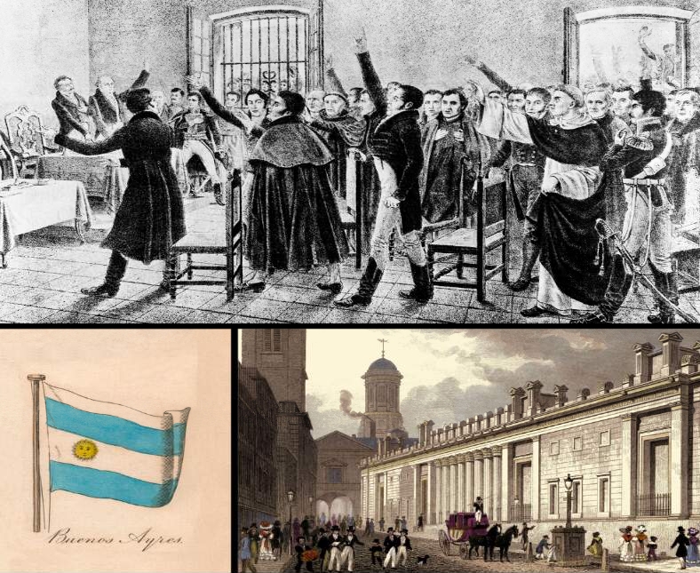 Аргентина провозглашает независимость от Испании. Слева-английская иллюстрация флага «Буэнос-Айрес» 1838 года, справа — Банк Англии в Лондоне в 1828 году. Источник: Getty Images