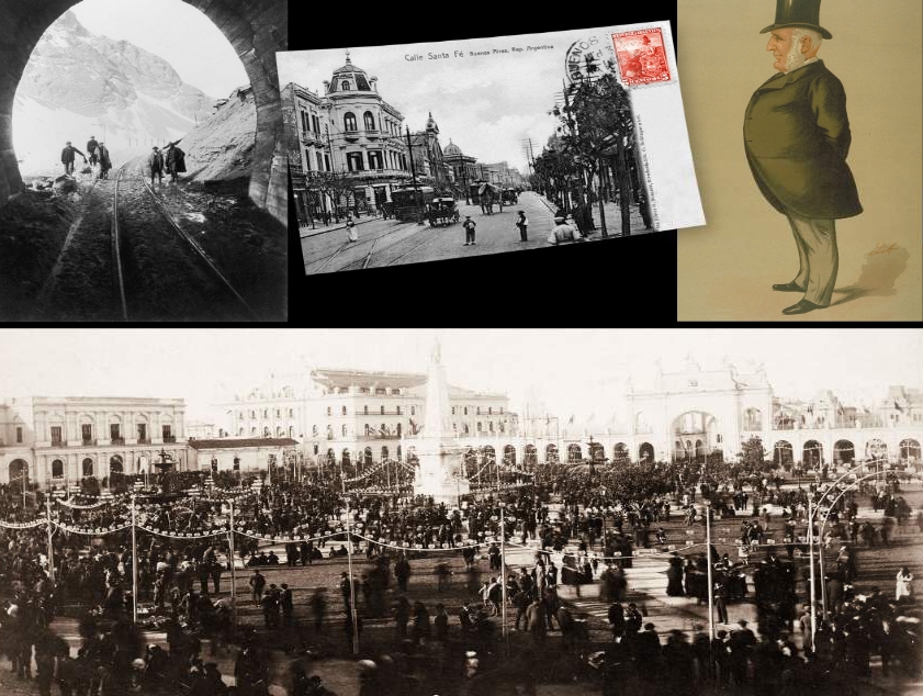 Сверху слева направо строительство Аргентинской железной дороги в Мендосе 1905, открытка Калле Санта-Фе в Буэнос-Айресе и карикатура с изображением 1-го лорда Ревелстока, старшего партнера в Barings во время кризиса. Ниже толпа на площади Пласа-де-ла-Виктория (Plaza de Mayo) 1880. Источник: Getty Images