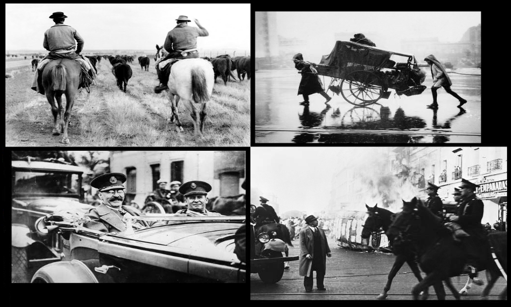 По часовой стрелке слева, ковбои пасут крупный рогатый скот в 1951 году, торговцы тянут свою тележку через затопленную улицу в Буэнос-Айресе в 1930 году, автобус горит на Пласа-де-Майо во время революции 1943 года и Хосе Феликса Урибуру в 1930 году. Источник: Getty Images