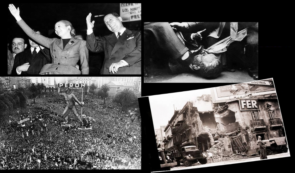 Слева Хуан и Ева Перон приветствуют толпу в 1951 году, а сторонники Перона собираются перед президентским дворцом в 1948 году. Справа люди стоят перед лицом бюста Хуана Перона и здания, поврежденного армейскими танками и пушками во время восстания в 1955 году. Источник: Getty Images