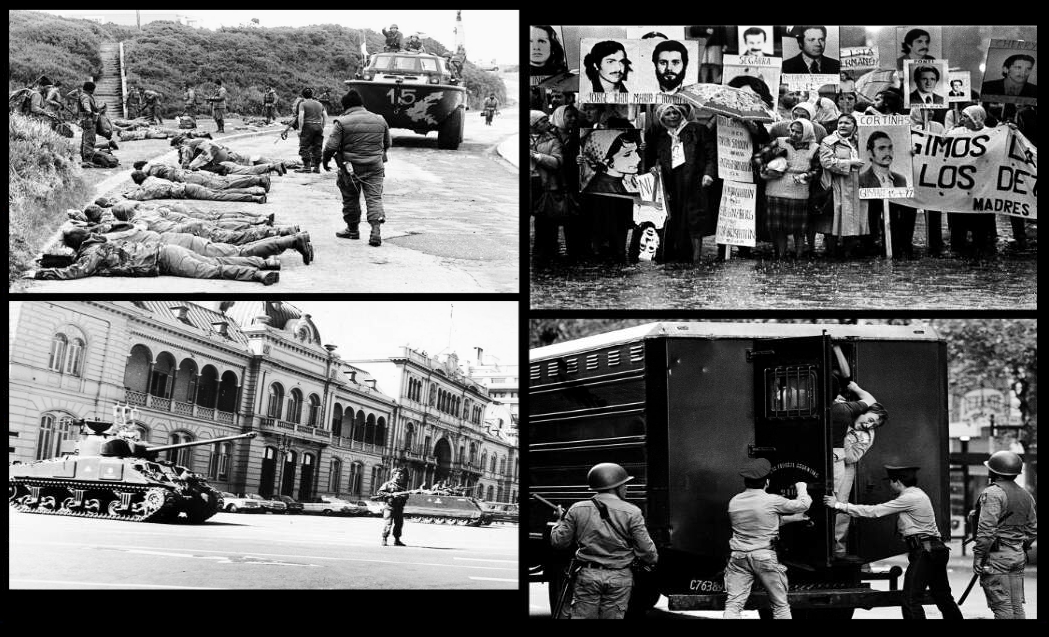Слева британские войска сдаются в Порт-Стэнли, Фолклендские острова, в 1982 году, а солдаты охраняют Каса-Росада после переворота в 1976 году. Справа матери держат фотографии своих пропавших детей во время демонстрации против диктатуры, протестующий арестован в Буэнос-Айресе в 1982 году. Источник: Getty Images