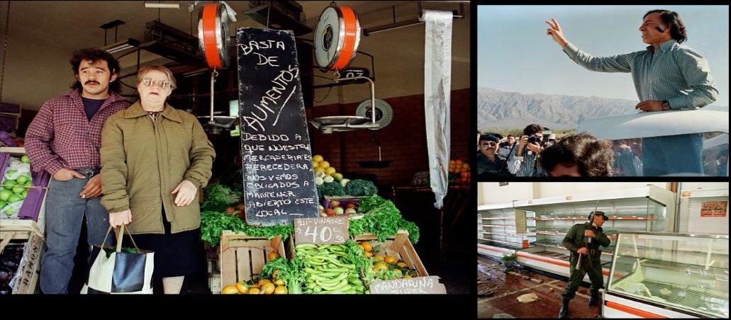 Слева владельцы производственных площадок протестуют против инфляции. Справа - Карлос Менем во время предвыборной кампании и солдат, осматривающий разграбленный супермаркет в Росарио. Источник: Getty Images