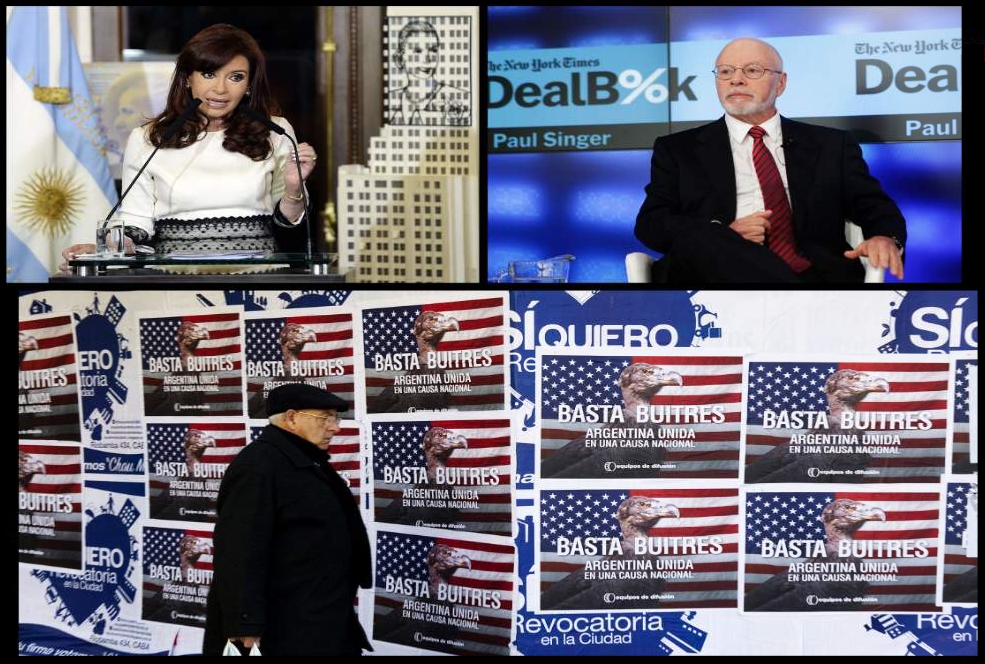 Вверху Кристина Фернандес де Киршнер и Пол Сингер. Ниже плакаты протеста против «фондов-стервятников» в Буэнос-Айресе в 2014 году. Источник: Getty Images