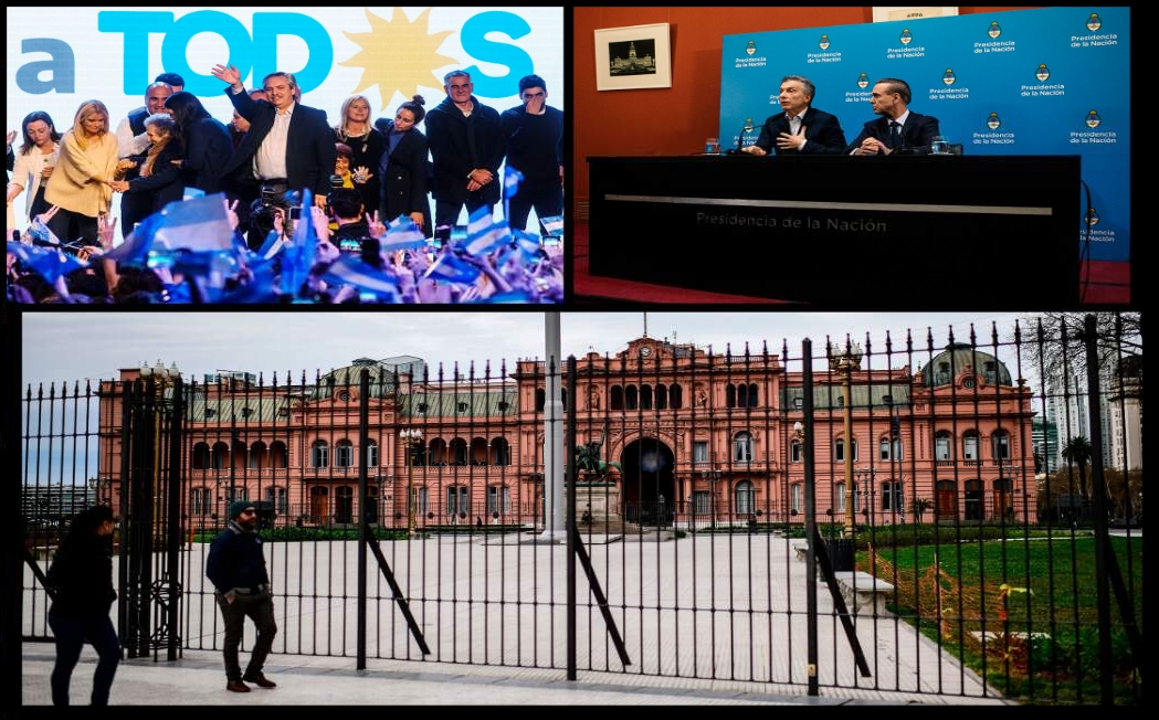 Вверху слева Альберто Фернандес машет сторонникам, а справа, 12 августа, Маурисио Макри дает пресс-конференцию. Ниже 30 августа стоит забор перед зданием Casa Rosada.