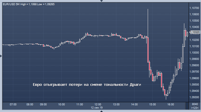 Евро отыграл все потери после того, как президент ЕЦБ Марио Драги отметил, что вероятность рецессии низкая, добавив что отрицательные показатели создали много положительных эффектов. Он парировал претензии Трампа, прозвучавшие после сегодняшнего снижения ставки, заявив, что ЕЦБ не преследует цели конкурентной девальвации. EUR/USD взлетел более чем на фигуру от минимума дня, поднявшись в моменте до уровня 1.1041. Ранее евровалюта падала на 0.8% до 1.0926.