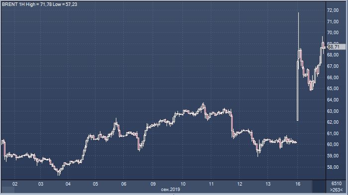 Котировки на рынке нефти демонстрируют позитивную динамику на торгах в понедельник 17 сентября. Brent растет на 14% до $68.65 за баррель, при этом WTI дорожает на 13.86% до $62.45 за баррель.