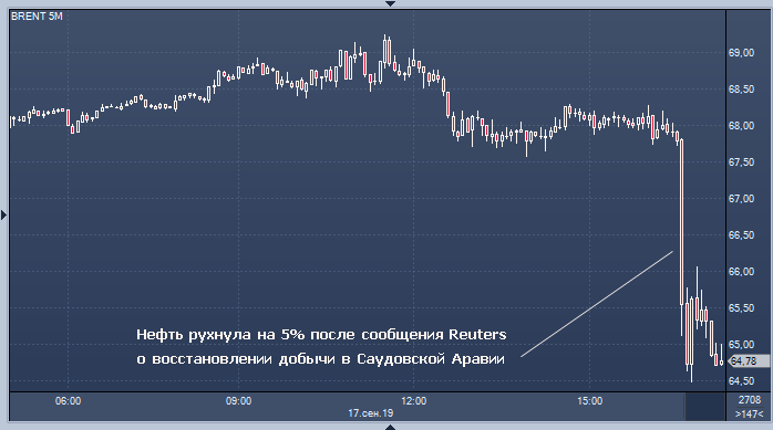 В Лондоне нефть упала более чем на 6% после того, как агентство Reuters сообщило, что Саудовская Аравия близка к восстановлению 70% добычи нефти, потерянной после атаки в эти выходные. Нефть сорта Brent упала до 64.48 долл. / барр. на новости, которые сослались на неизвестный саудовский источник, который заявив, что королевство вернется к полной добыче в ближайшие две-три недели. Министр энергетики Саудовской Аравии принц Абдулазиз бин Салман во вторник планирует провести брифинг для прессы в Джидде.