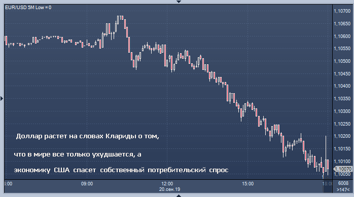 Курс доллара резко вырос после того, как заместитель председателя Федеральной резервной системы США Ричард Кларида заявил, что мировая экономика явно «замедляется», однако он уверен в том, что потребитель США поддержит американскую экономику. Такова версия Bloomberg. Индекс доллар Bloomberg растет на 0.1% и близок к максимальному значению пятничной сессии, восстанавливая более ранние потери 0.2%. EUR/USD теряет 0.4% до ~ 1.1004; он торговался на ~ 1.1021 перед комментариями Клариды. AUD/USD теряет 0.3% и находится вблизи сессионных минимумов 0.6771. NZD/USD теряет 0.7% до 0.6259 против минимума сессии 0.6257, самого низкого уровня с сентября 2015 года. USD/CAD растет на 0.3%. и дневной пик составил 1.3300. USD/JPY мало изменился и остается на ~ 108.01.