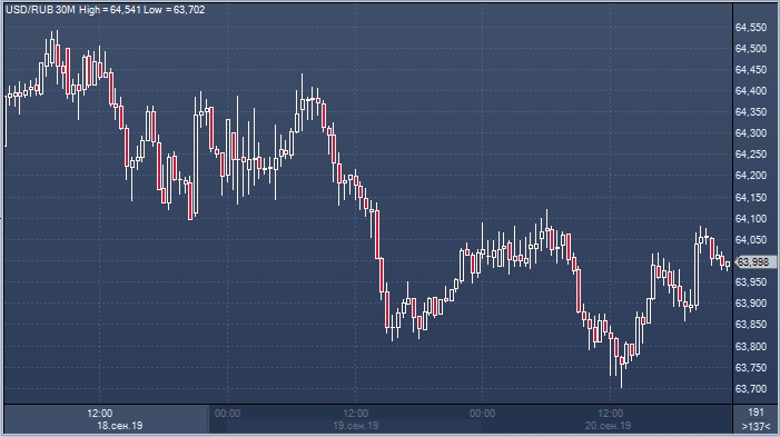 На торгах в пятницу рубль предпринимал активные попытки закрепиться ниже 64 за доллар. Внутридневной минимум курс USDRUB сформировал на 63.70, однако к вечеру российская валюта утратила свои достижения — котировки вновь чуть выше психологической фигуры 64.00.