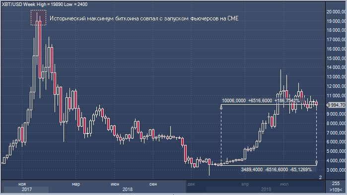 Курс биткоина в 2019 году вырос почти на 187% и вечером в воскресенье, 22 сентября, торгуется в районе $10 000 за монету.
