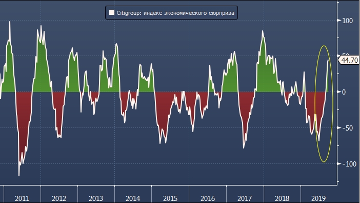 Снижение ставок по ипотечным кредитам улучшило состояние рынка недвижимости, потребительские расходы выглядят стабильно, а июльские данные по производственным заказам и промышленному производству за август превзошли прогнозы. Эта, а также другая макроэкономическая статистика привела к росту индекса экономического сюрприза, рассчитываемого Citigroup, до максимальных значений с апреля 2018 года.