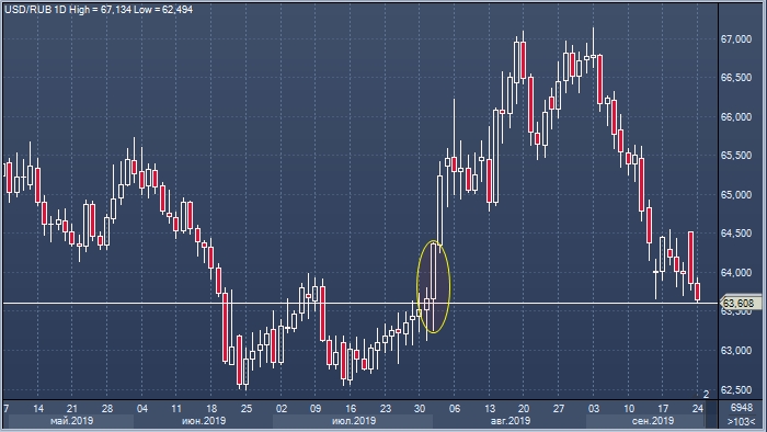 Курс рубля на торгах в понедельник смог закрепиться ниже 64 за доллар. По состоянию на середину торгов во вторник, 24 сентября, российская валюта прилагает усилия к расширению свои достижений. В рамках торгов был сформирован локальный минимум курса доллар/рубль на уровне 63.60. Это новый минимум с 1 августа. В тот день рубль существенно обесценился к валюте США из-за обвала цен на нефть, что стало реакцией на заявление Дональда Трампа о новых пошлинах против китайской продукции.