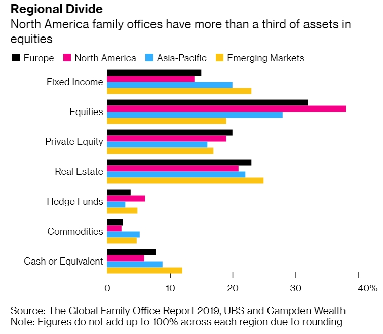 Эту точку зрения на рынке разделяют многие из 360 глобальных одно- и многосемейных офисов, опрошенных UBS Global Family Office, согласно их отчету за 2019 год, который был подготовлен совместно с Campden Research и выпущен в понедельник. Большинство ожидает, что мировая экономика вступит в рецессию к 2020 году, с самым высоким процентом мрачных респондентов на развивающихся рынках. Около 42% семейных офисов по всему миру накапливают денежные резервы.
