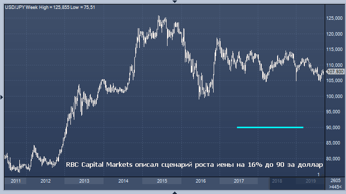 Очередной этап ралли суверенных облигаций, пленившего инвесторов за последний год, может подтолкнуть доходность 10-летних облигаций Казначейства ниже 1% и отправить иену вверх более чем на 16% с текущих уровней, согласно анализу RBC Capital Markets. Сценарий повышения иены до 90 за доллар не является базовым прогнозом банка.