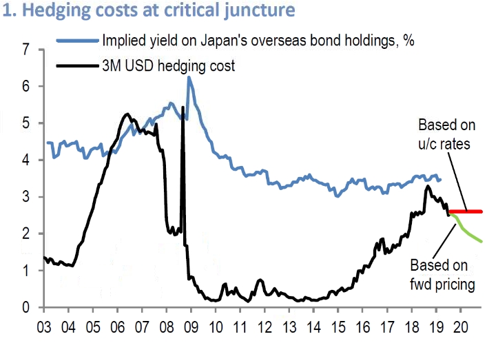 «Если ставки будут меняться так, как сейчас показывает форвардная кривая (зеленая линия), клин между доходностью японского портфеля и стоимостью хеджирования станет значительным, и было бы удивительно, если мы не увидим ярых попыток японских инвесторов застраховать иностранные инвестиции», — написали они в отчете, имея ввиду, в первую очередь, хеджирование Японского государственного пенсионного инвестиционного фонда — крупнейший в мире пенсионный фонд. «В двух словах, именно поэтому мы считаем, что ставки в США находятся на таком критическом этапе для доллар/иены», — заключила команда.