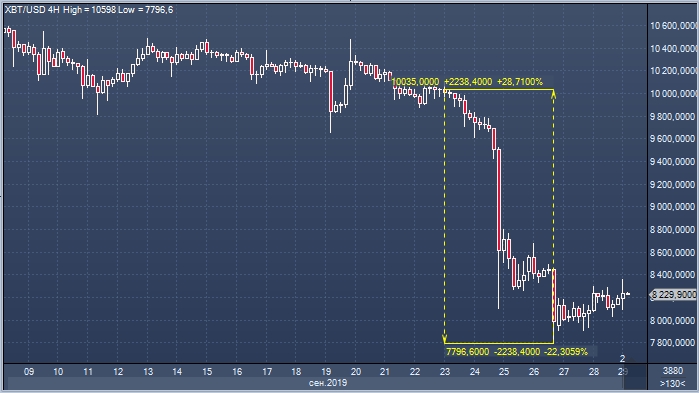 Наиболее популярная криптовалюта начинала неделю в районе 10000 долларов за монету. Во вторник, на следующий день после старта торгов фьючерсами на биткоин с возможностью физической поставки на платформе Bakkt, криптовалютный флагман резко подешевел с 9800 до 8100 за BTC. А в четверг биткоин сформировал минимум на уровне 7800 за монету.