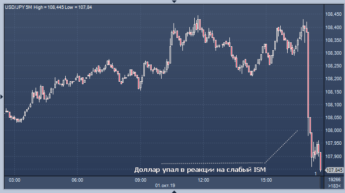 Курс доллара упал после неожиданно резкого снижения индикатора состояния производства в США, который продемонстрировал самое слабое значение с конца последней рецессии. Сказалось замедление мировой экономики и американо-китайская торговая война, которая все более негативно влияет на промышленный сектор Америки. Институт управления поставками обнародовал индекс ISM в промышленном секторе США во вторник, который в сентябре снизился до 47.8 пункта, самого низкого уровня с июня 2009 года. Эта цифра оказалась ниже всех оценок в опросе Bloomberg. В среднем экономисты ожидали рост индекса до 50 пунктов с 49.1 августа.