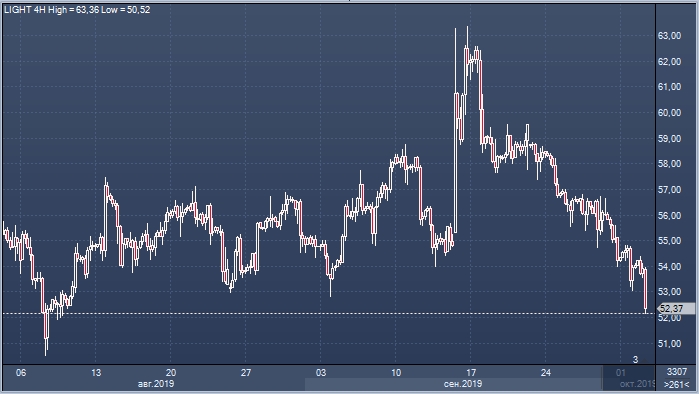 Декабрьские фьючерсы на североморский бенчмарк Brent снижаются на момент написания статьи на 2.45% до $57.45 за баррель. Американская WTI теряет в цене 2.13%, опустившись до $52.48 за баррель. Суточный минимум WTI сформировала на уровне $52.25 за баррель, что является наихудшим значением с 8 августа.
