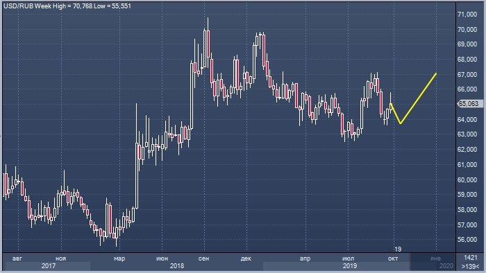 К концу месяца курс доллар/рубль может краткосрочно опуститься ниже 64.00 при отсутствии того, что Великобритания не покинет ЕС без сделки (жёсткий Brexit), а торговые переговоры США и Китая не продемонстрируют ухудшения. Если ФРС в октябре сократит ставку по федеральным фондам на 25 базисных пунктов, аппетит к риску, но мировых фондовых рынках улучшится даже несмотря на замедление глобальной экономики.