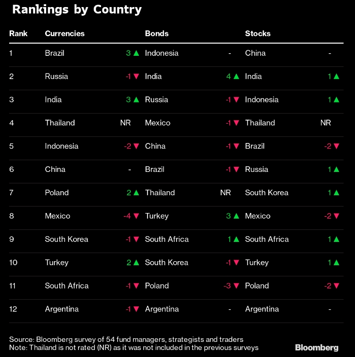 Таковы результаты ежеквартального опроса агентства Bloomberg, в котором участвовали 54 инвестора, трейдера, стратега, ответивших на вопросы о перспективах активов развивающихся рынков.
