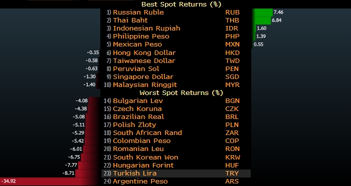 Российский рубль в сегменте развивающихся рынков (Emerging Markets) с начала 2019 года по-прежнему остается лучшим по динамике к доллару США. Рубль укрепился к американскому конкуренту с 1 января текущего года на 7.46%. На втором месте среди валют EM тайский бат, который вырос к доллару на 6.84%.
