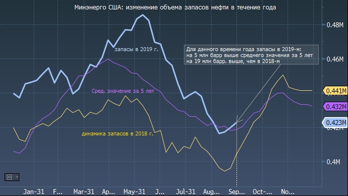 Данные Минэнерго США на этой неделе покажут, что коммерческие запасы нефти за отчетную неделю до 4 октября вырастут на 1.95 млн баррелей. Таков средний прогноз экспертов, опрошенных агентством Bloomberg. При этом 7 экспертов пророчат рост запасов и 1 прогнозирует снижение.