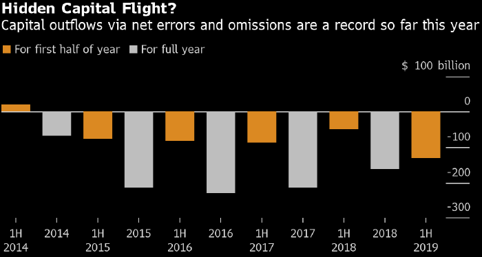 Собственные оценки агентства Bloomberg подразумевают, что в первые семь месяцев текущего года отток капитала из Китая составил $226 млрд, что на 19% выше аналогичного показателя прошлого года.