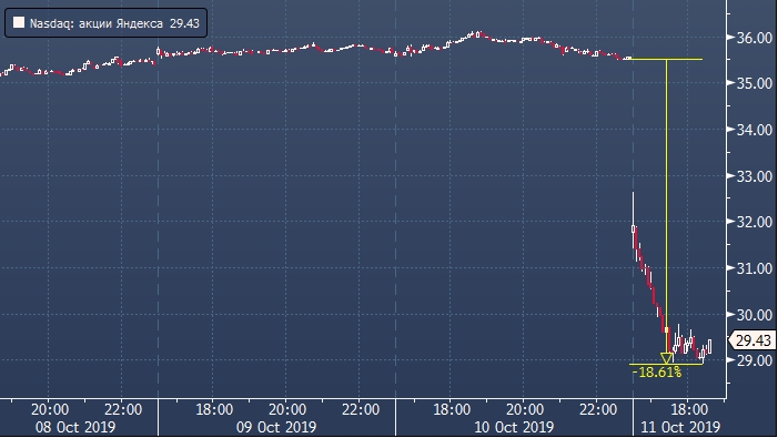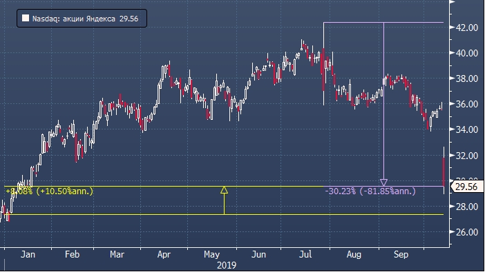 С начала года, учитывая реализованный в пятницу обвал, акции Яндекса на Nasdaq подорожали на 8%. Максимум 2019 года сформирован 26 июня на уровне 42.37 доллара за акцию. От годового пика падение составляет 30%.