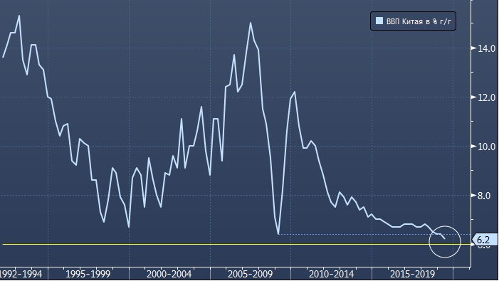 В пятницу, 18 октября будут опубликованы данные по ВВП Китая по итогам 3 квартала 2019 года. По итогам второй квартальной четверти рост ВВП КНР составил 6.2% к аналогичному кварталу годом ранее. Это самые низкие темпы за всю историю статистики показателя с 1992 года. Даже во время мирового финансового кризиса 2008—2009 гг. экономический рост Китая резко замедлился до 6.4% г/г.