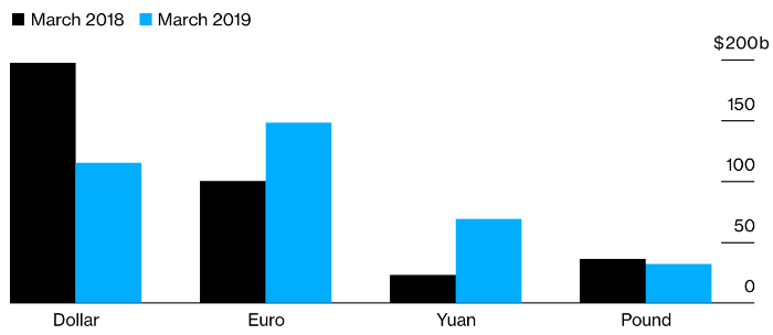 В рамках политики, направленной на снижение зависимости от американской экономики, Центробанк России продавал долларовые активы и одновременно наращивал инвестиции в евро и юань. Однако с точки зрения доходности стратегия оказалась не самой выгодной, потому что доллар за этот период подорожал на 6,5%. Если бы ЦБ оставил структуру резервов прежней, то, по расчетам Bloomberg, их стоимость выросла бы на 3,8% за год, закончившийся в марте.