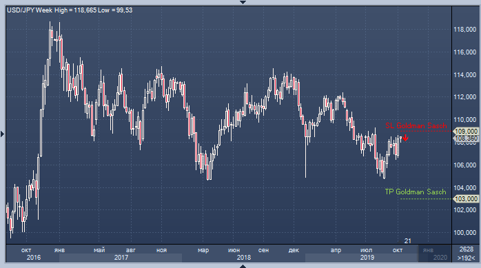 Стабилизация выше 106.50 и улучшение атмосферы на фондовых рынках воодушевили быков по USDJPY на новую попытку развить наступление, однако в Goldman Sachs не верят в успех предприятия. Валютные стратеги банка рекомендуют продавать пару по рынку со стопом на 109 и целью на 103. Они считают, что короткая позиция в USDJPY остается привлекательным и недооцененным хеджем на случай дальнейшего ослабления роста экономики США или же нового витка торговой войны. В Goldman Sachs обращают внимание на ограниченные возможности дальнейшего смягчения политики Банка Японии особенно в сравнении с ФРС, а также на ожидания того, что торговая война, вероятно, продлится вплоть до президентских выборов США, которые пройдут в ноябре 2020 года.