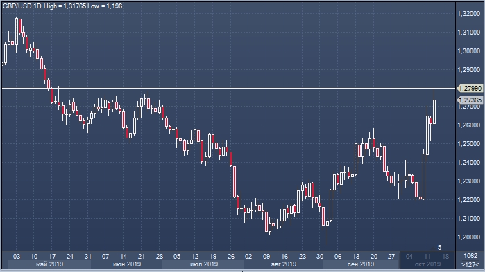 Курс фунта по отношению к доллару на торгах во вторник, 15 октября, достиг максимума с 21 мая на уровне 1.2800. Поддержку британской валюте оказали сообщения о том, что Великобритания и Евросоюз близки к соглашению по Brexit.