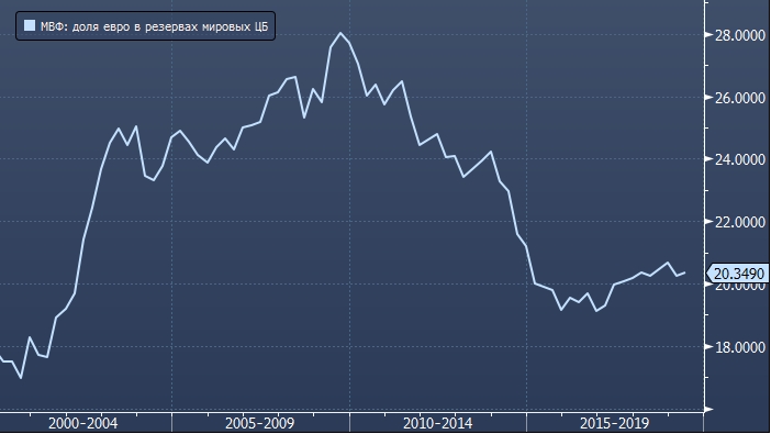 В настоящий момент доля евро в резервах мировых ЦБ составляет чуть более 20%, свидетельствует статистика МВФ.