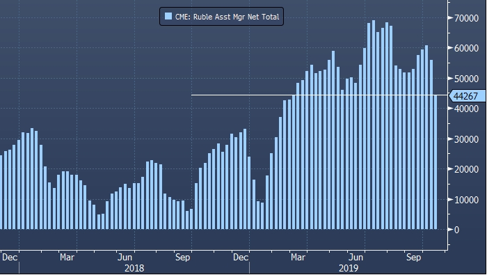 При этом длинная позиция по рублю управляющих фондами (которая традиционно противоположна позиции спекулянтов, использующих для торговли заемные средства) сократилась на 11 777 до 44 267 контрактов. Это минимум с мая текущего года.