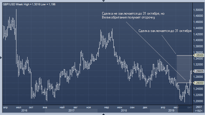 «Если до 31 октября сторонам так и не удастся найти консенсус, то фунт/доллар, вероятно, снизится в область 1.26», - отмечают аналитики банка. - «При этом мы не думаем, что он пойдет намного ниже (например к 1.20), так как при провале переговоров Великобритания, скорее всего, получит очередную отсрочку».