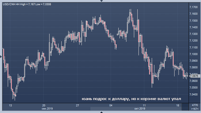 Китайский юань упал до рекордно низкого уровня по отношению к своим аналогам после того, как европейские валюты выросли в надежде на сделку по Brexit. Индекс Bloomberg CFETS RMB, который отслеживает юань по отношению к корзине валют торговых партнеров, находится на самом низком уровне с началом 2015 года. Показатель снижался на протяжении всех, кроме одной, сессии в этом месяце. Борис Джонсон предпринимает новые шаги, чтобы выполнить свое обещание вывести Великобританию из Европейского союза 31 октября, на фоне растущего оптимизма, что он теперь имеет поддержку, чтобы провести свою сделку через парламент.