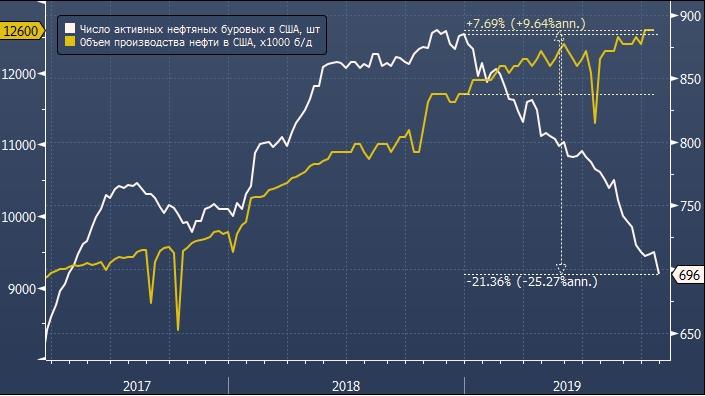 С начала текущего года количество нефтяных буровых уменьшилось на 21.4%, при этом добыча в США за тот же период выросла на 7.7% до 12.6 млн б/д. Это абсолютный максимум показателя за всю историю.