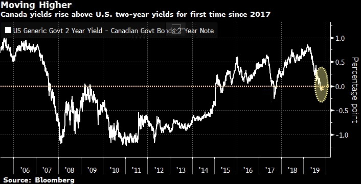 На графике представлено спред двухлетней доходности США/Канады