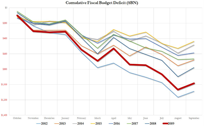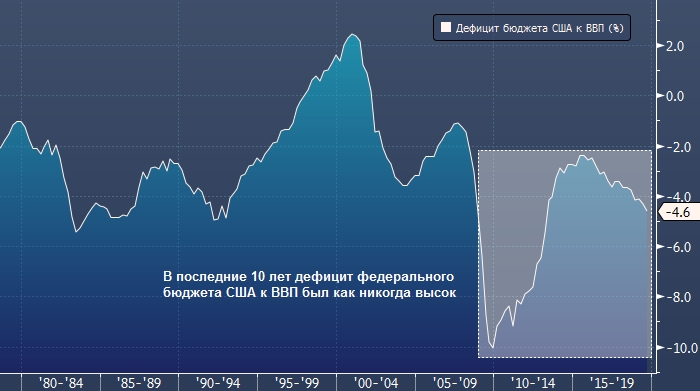 По результатам финансового года, завершившегося 30 сентября, дефицит федерального бюджета составил 4.6% от ВВП. Это — отчетливый сигнал о том, что текущий десятилетний экономический цикл очень сильно зависит от поддержки со стороны правительства.