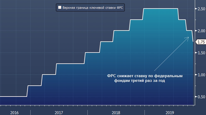 ФРС убрала из текста заявления фразу о «готовности принимать необходимые меры для поддержки экономического роста», и добавила обещание следить за данными, чтобы «оценить подходящую траекторию ставки по федеральным фондам». Это говорит о намерении регулятора на какое-то время взять паузу в цикле снижения ставок, полагают эксперты Bloomberg.