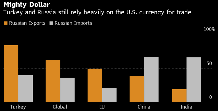 В первом полугодии Турция оплатила долларами 83% всего импорта из России, сообщил на этой неделе ЦБ РФ. 40% российского экспорта в Европу также были оплачены американской валютой (ProFinance.ru: на приведенном выше графике указано, какой процент российского экспорта в / импорта из некоторых стран и регионов оплачивается долларами).