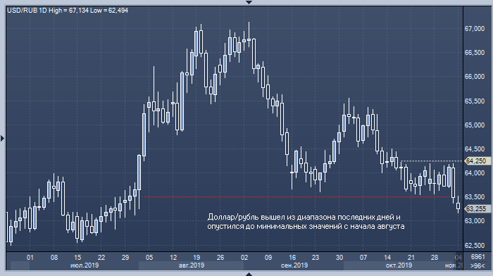 С середины октября доллар/рубль консолидировался неподалеку от отметки 64, однако в пятницу резко снизился, опустившись до минимальных значений с 1 августа. Это движение было спровоцировано общей слабостью американской валюты и усилением спроса на рискованные активы, вроде валют развивающихся стран.