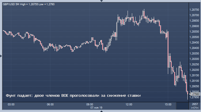 Стерлинг упал на голубиный сюрприз Банк Англии, который проголосовал 7–2 за то, чтобы сохранить ставки без изменений. Собственно, эти двое и стали сюрпризом. Они выступили за снижение ставки. Их имена: Майкл Сондерс и Джонатан Хаскель. Они хотели снизить контрольный показатель на четверть пункта. Это первый раз, когда члены банка проголосовали за более слабую политику с 2016 года. Причина: угроза для экономических перспектив и признаки того, что рынок труда может начать ухудшаться.