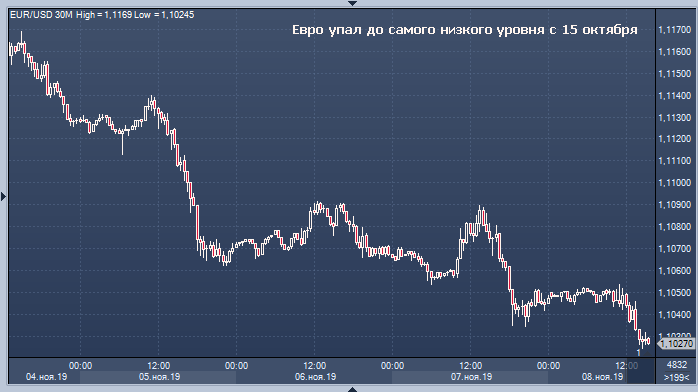 Евро упал на 0.2% до 1.1028, самого низкого уровня с 15 октября.