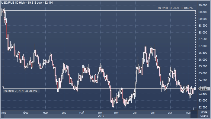 Реальный курс рубля к доллару за 10 месяцев 2019 года вырос на 4.5%, а к евро — на 8.6%.